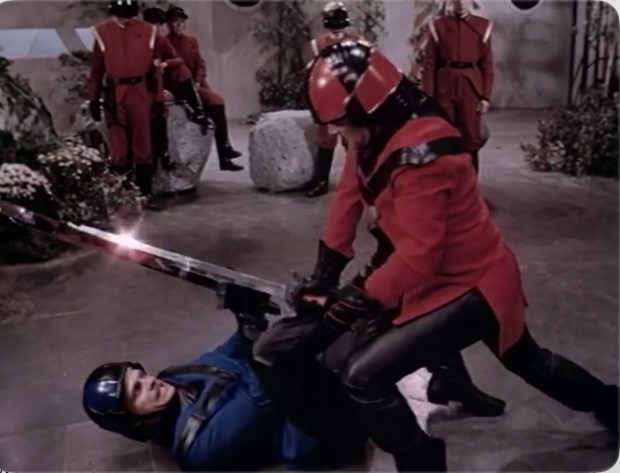 But of course this being a sci-fi show, it’s not going to be any old swordfight. These swords are “space swords” tipped with nuclear devices which makes absolutely no sense whatsoever. If they were nuclear tipped wouldn’t that take out everyone in at least a square mile of the fight? I mean that would be one way to end the show. Perhaps that’s where Sledge Hammer! got the idea?